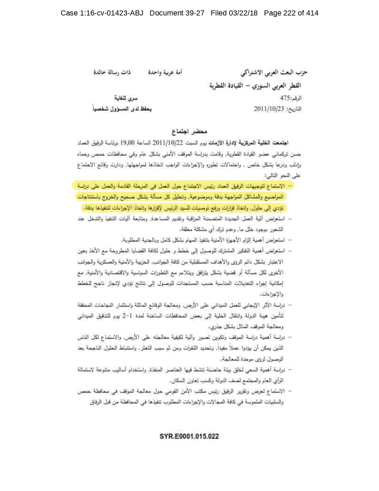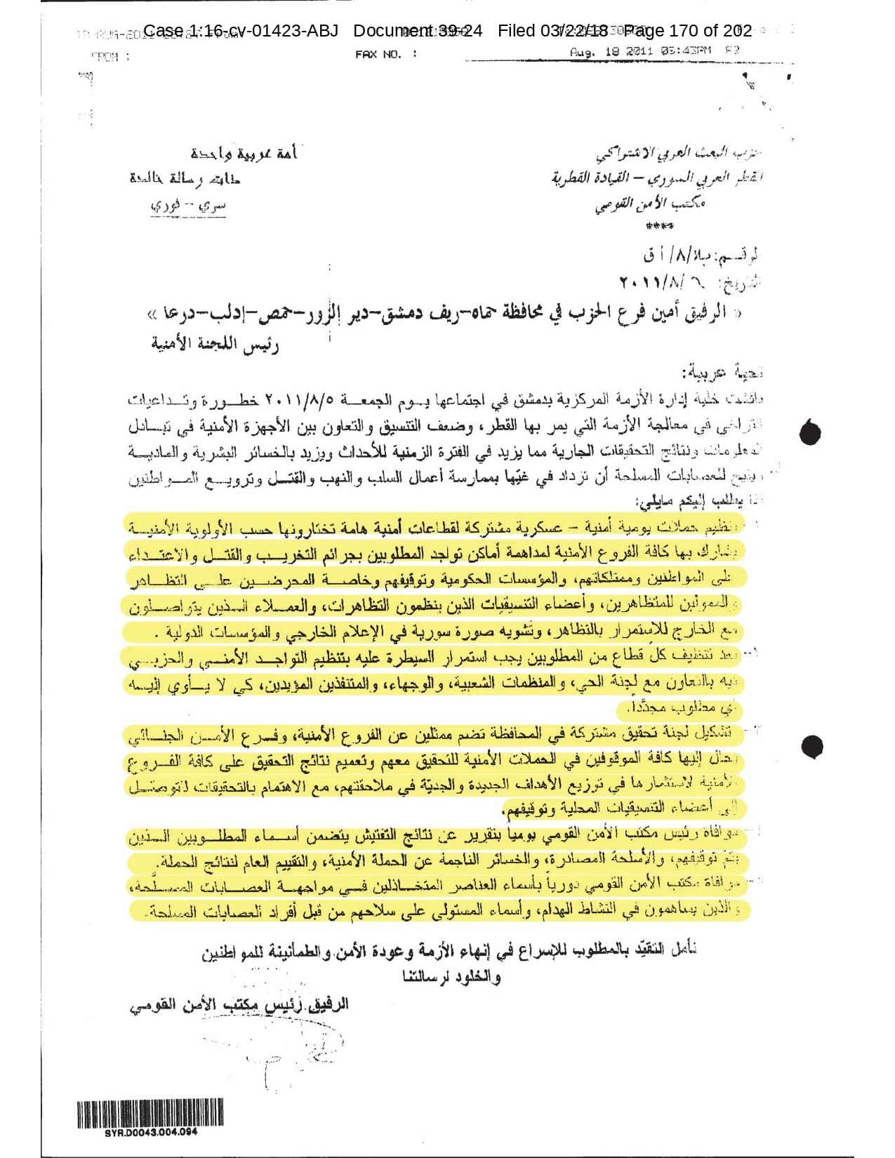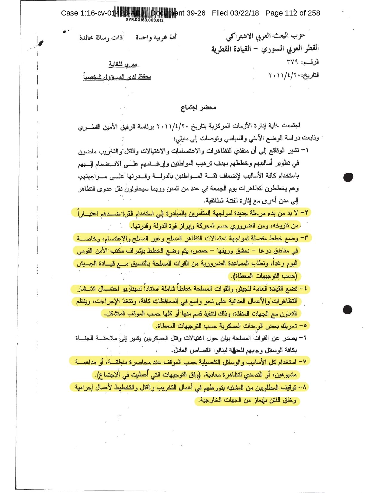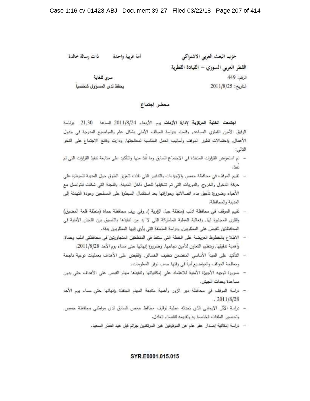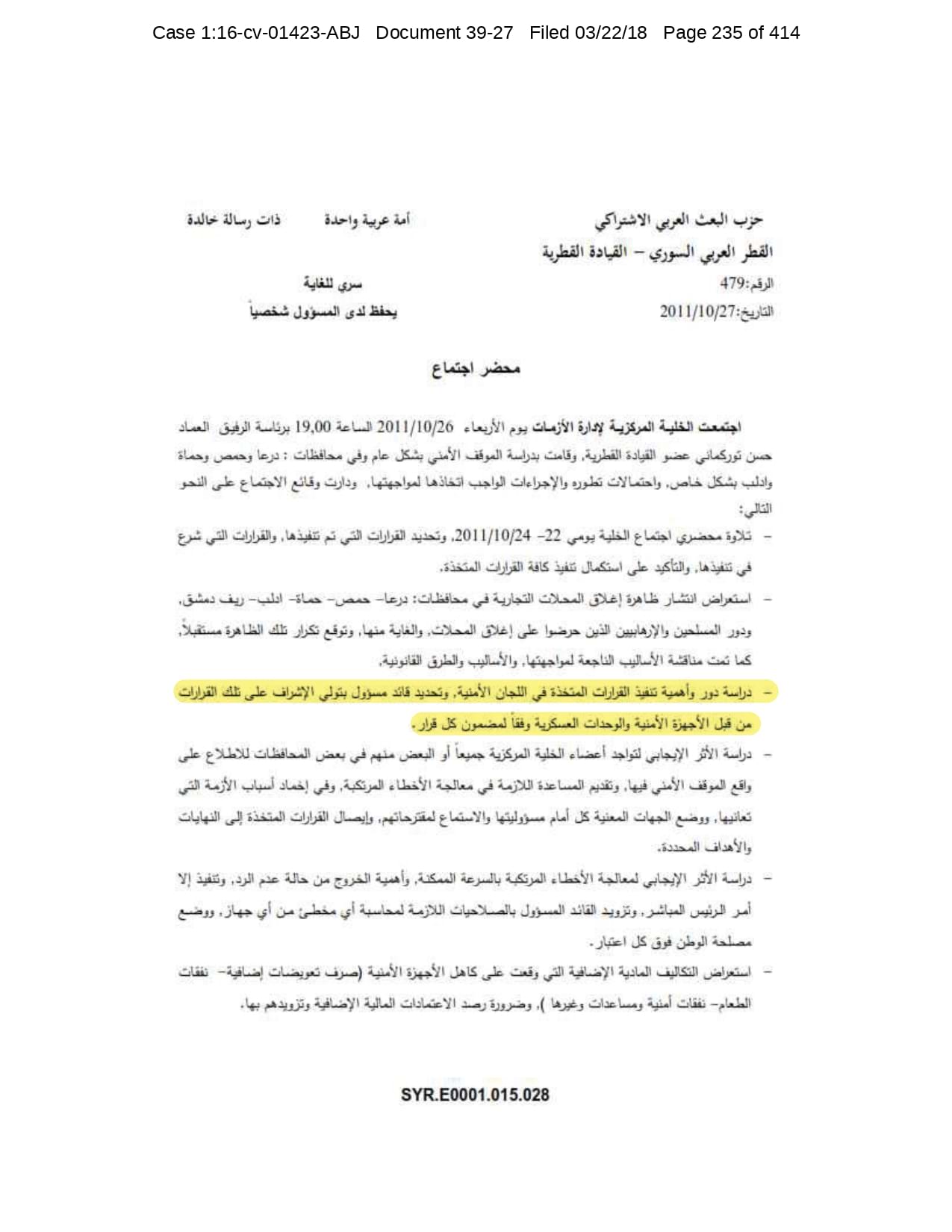 But the Regime’s own documents paint a different picture. As this report shows, the Syrian Regime knew that the demonstrators demanded freedom and democracy. Yet it formulated and then implemented policies to forcefully suppress opposition activity from early 2011. In doing so, the Regime – at its highest level - knew it was targeting civilians, many of them children, across the protesting governorates; it knew its reaction was so forceful that its own bureaucracy complained about the mounting number of dead, and did nothing to stop, prevent or punish those responsible. This report focuses on three distinct changes in the Regime’s strategy to quash the protests. In three separate Acts – played out in April, August and November 2011 – the Regime escalated its tactics to unimaginable levels, casting a dark shadow over the aspirations of the Syrians yearning for freedom.
