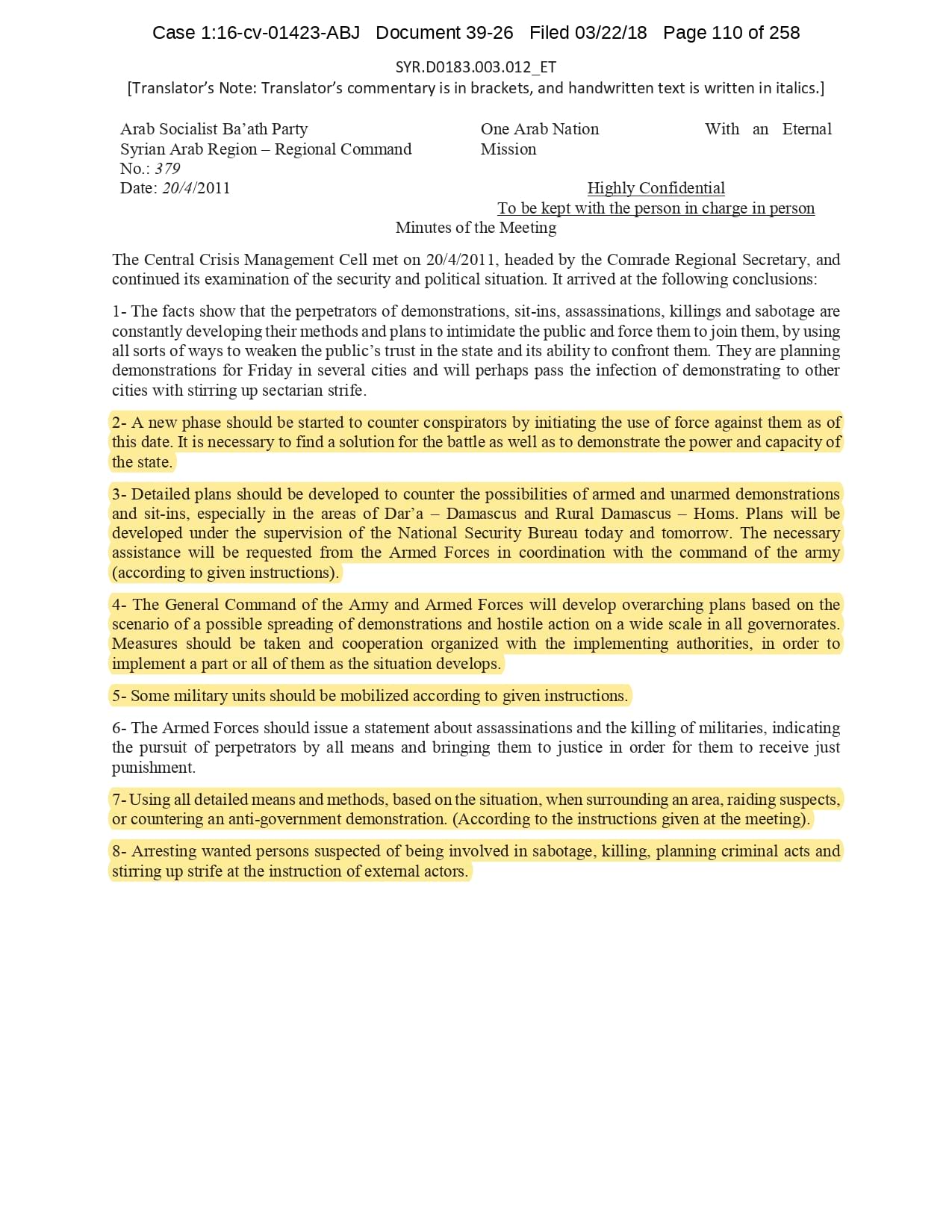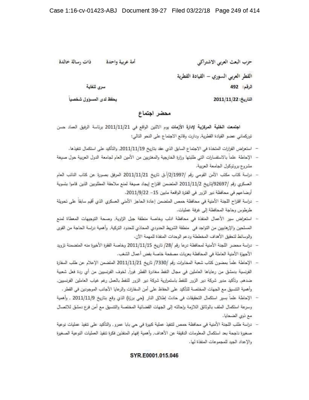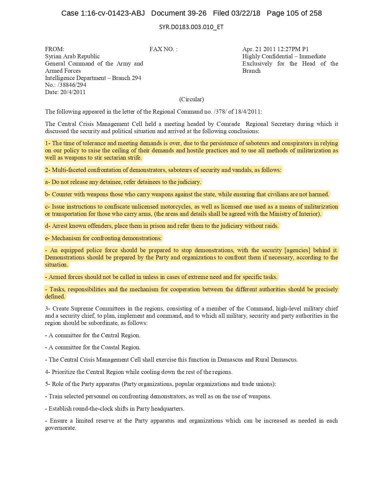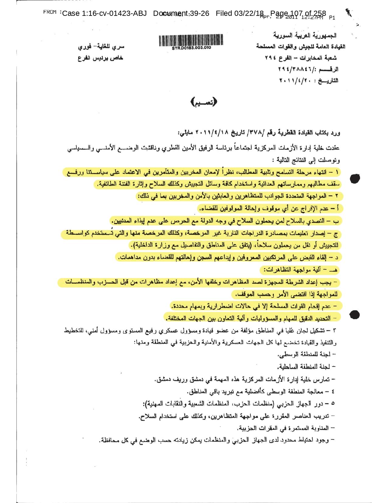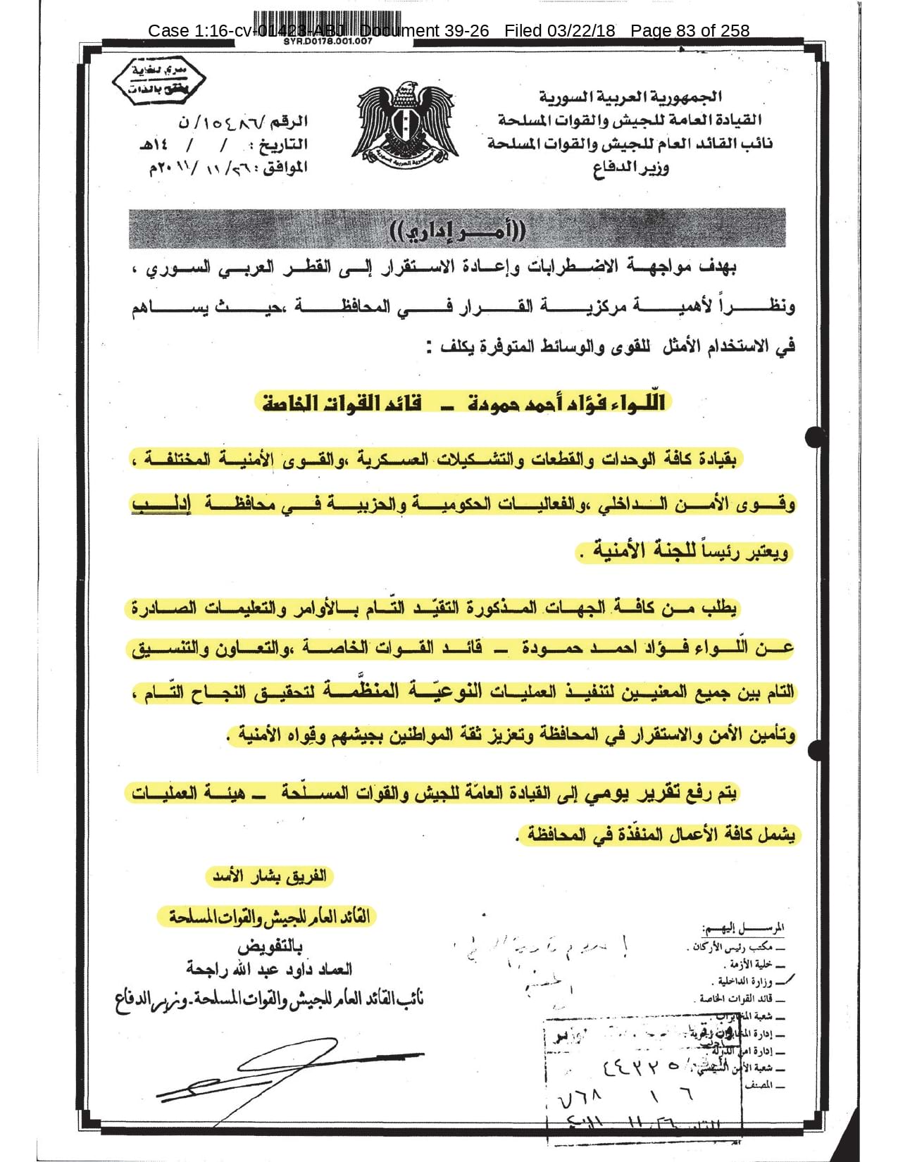 But the Regime’s own documents paint a different picture. As this report shows, the Syrian Regime knew that the demonstrators demanded freedom and democracy. Yet it formulated and then implemented policies to forcefully suppress opposition activity from early 2011. In doing so, the Regime – at its highest level - knew it was targeting civilians, many of them children, across the protesting governorates; it knew its reaction was so forceful that its own bureaucracy complained about the mounting number of dead, and did nothing to stop, prevent or punish those responsible. This report focuses on three distinct changes in the Regime’s strategy to quash the protests. In three separate Acts – played out in April, August and November 2011 – the Regime escalated its tactics to unimaginable levels, casting a dark shadow over the aspirations of the Syrians yearning for freedom.