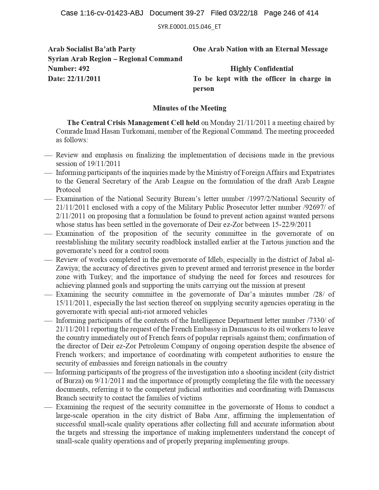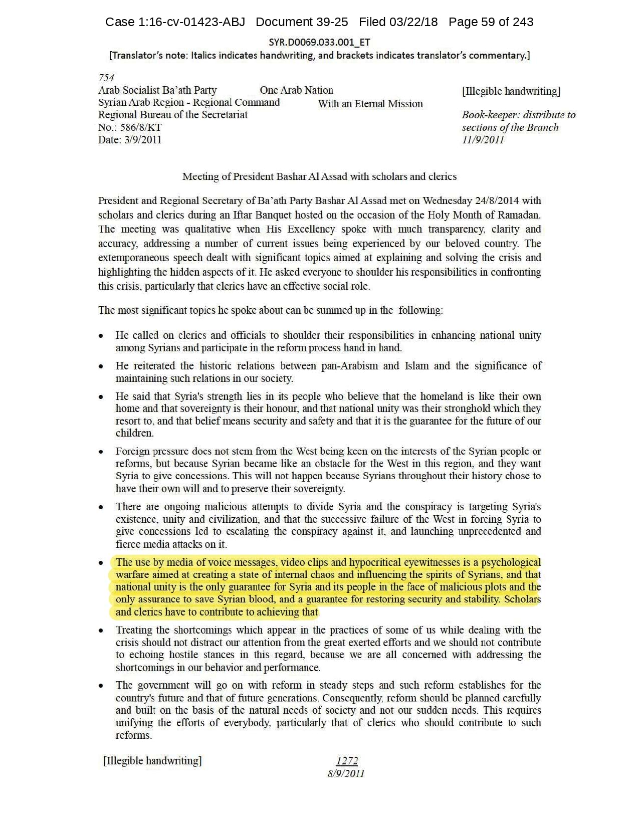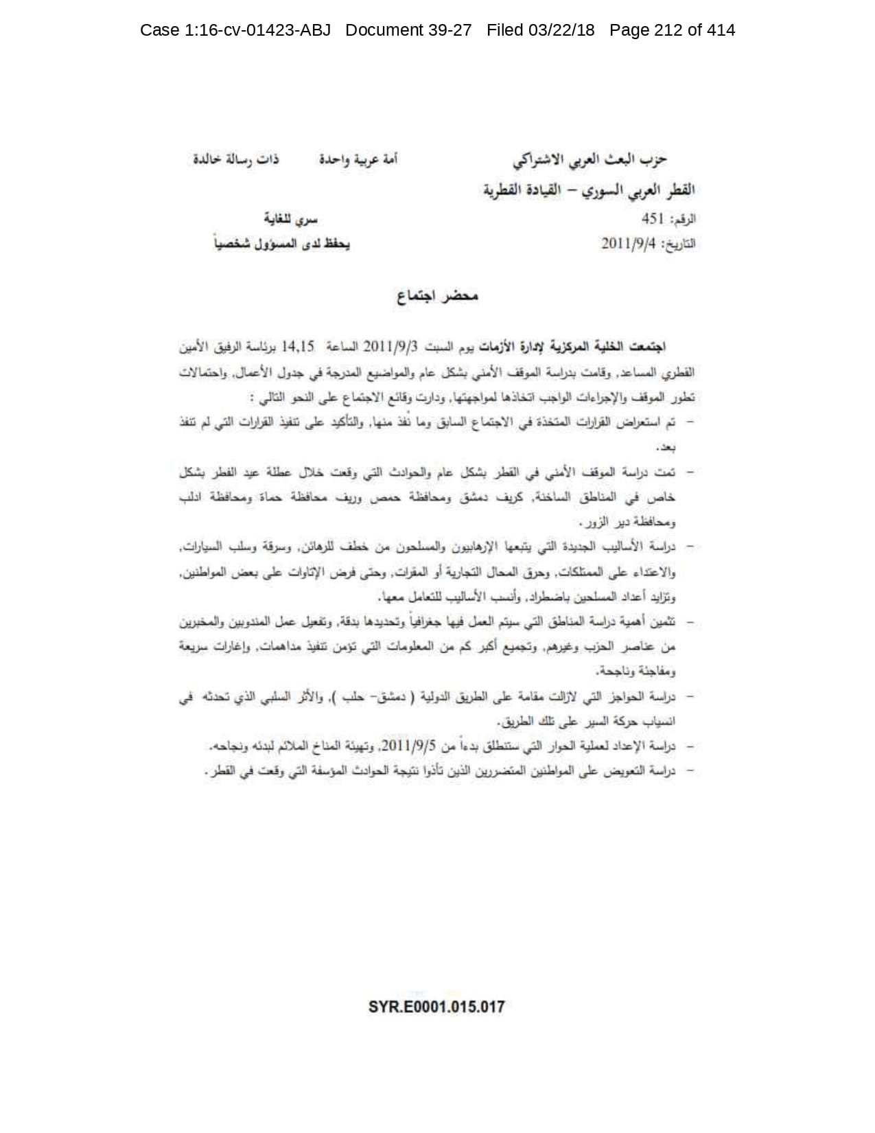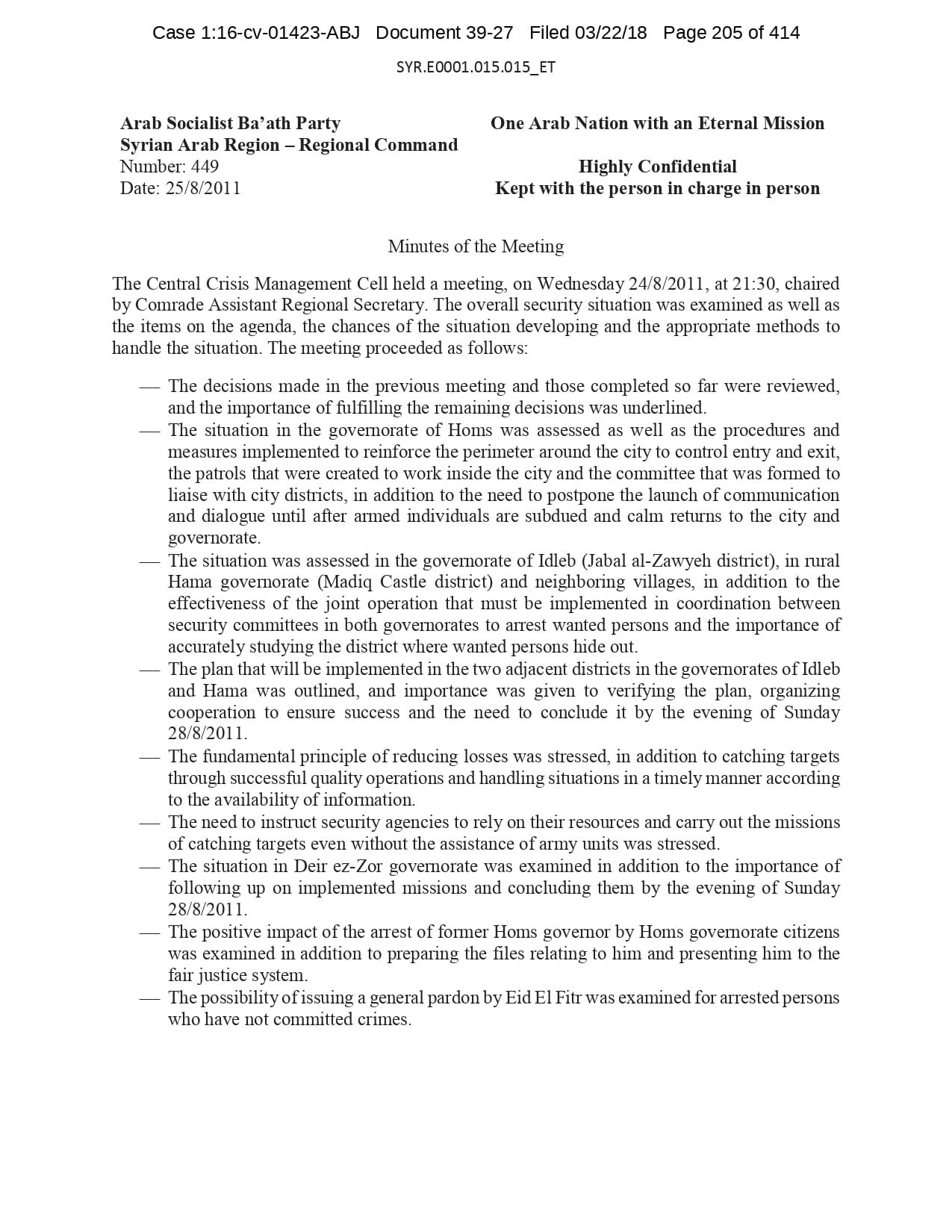 But the Regime’s own documents paint a different picture. As this report shows, the Syrian Regime knew that the demonstrators demanded freedom and democracy. Yet it formulated and then implemented policies to forcefully suppress opposition activity from early 2011. In doing so, the Regime – at its highest level - knew it was targeting civilians, many of them children, across the protesting governorates; it knew its reaction was so forceful that its own bureaucracy complained about the mounting number of dead, and did nothing to stop, prevent or punish those responsible. This report focuses on three distinct changes in the Regime’s strategy to quash the protests. In three separate Acts – played out in April, August and November 2011 – the Regime escalated its tactics to unimaginable levels, casting a dark shadow over the aspirations of the Syrians yearning for freedom.