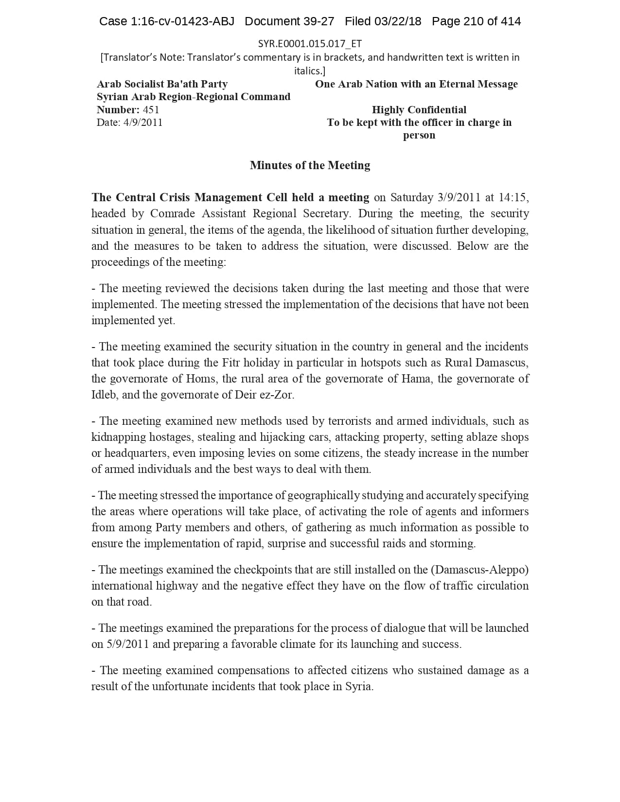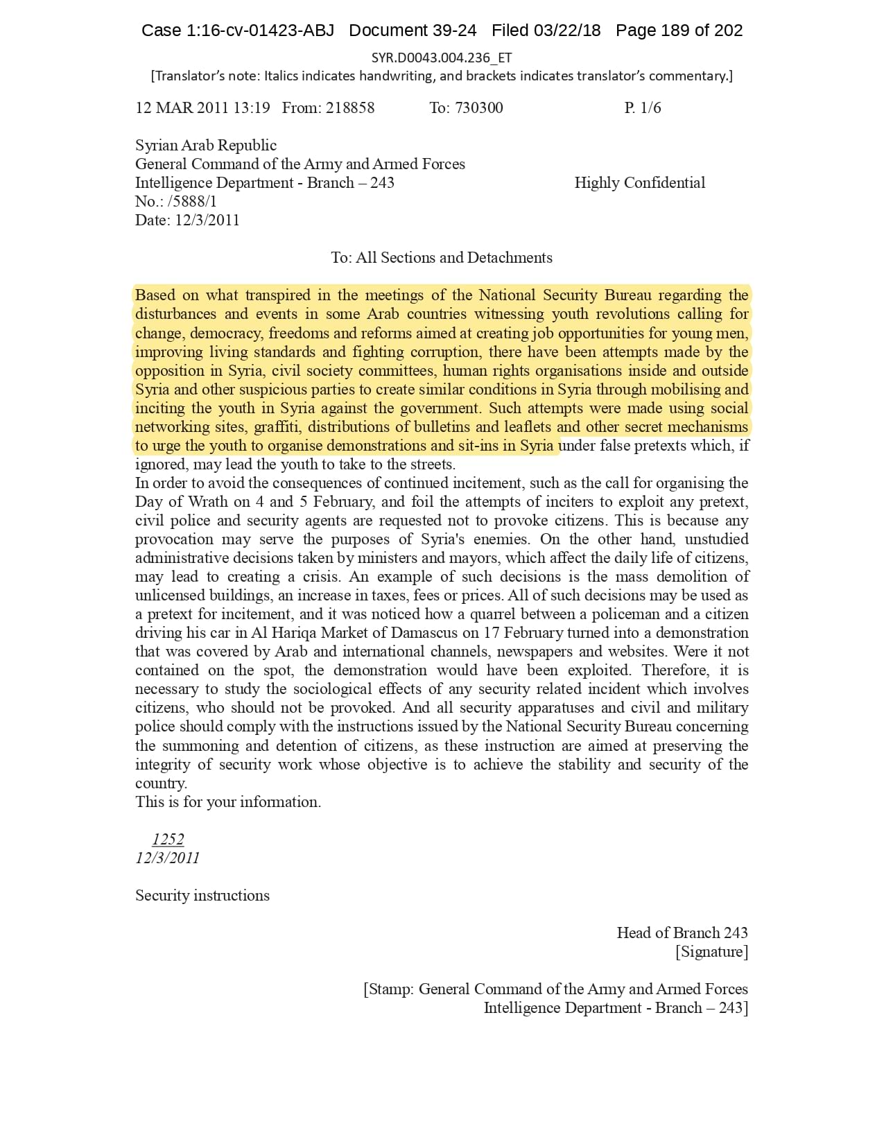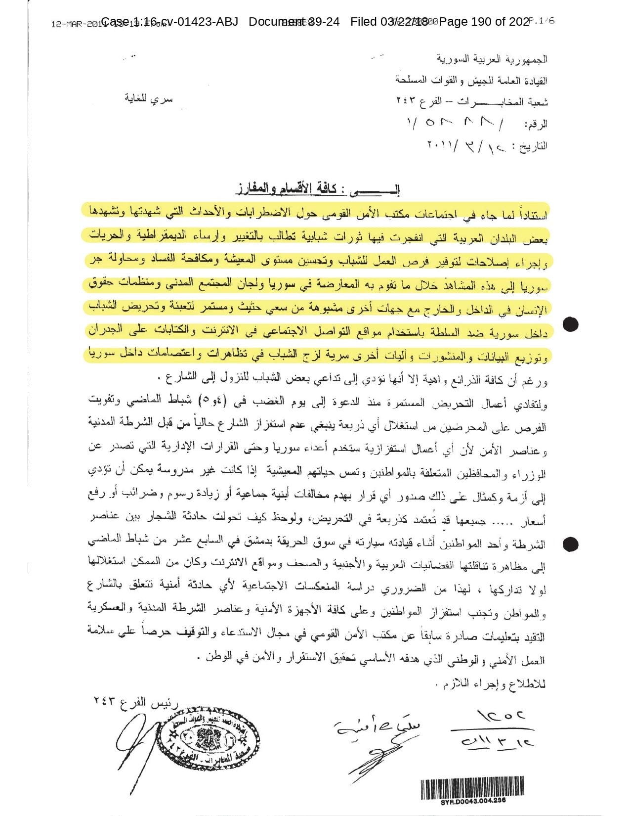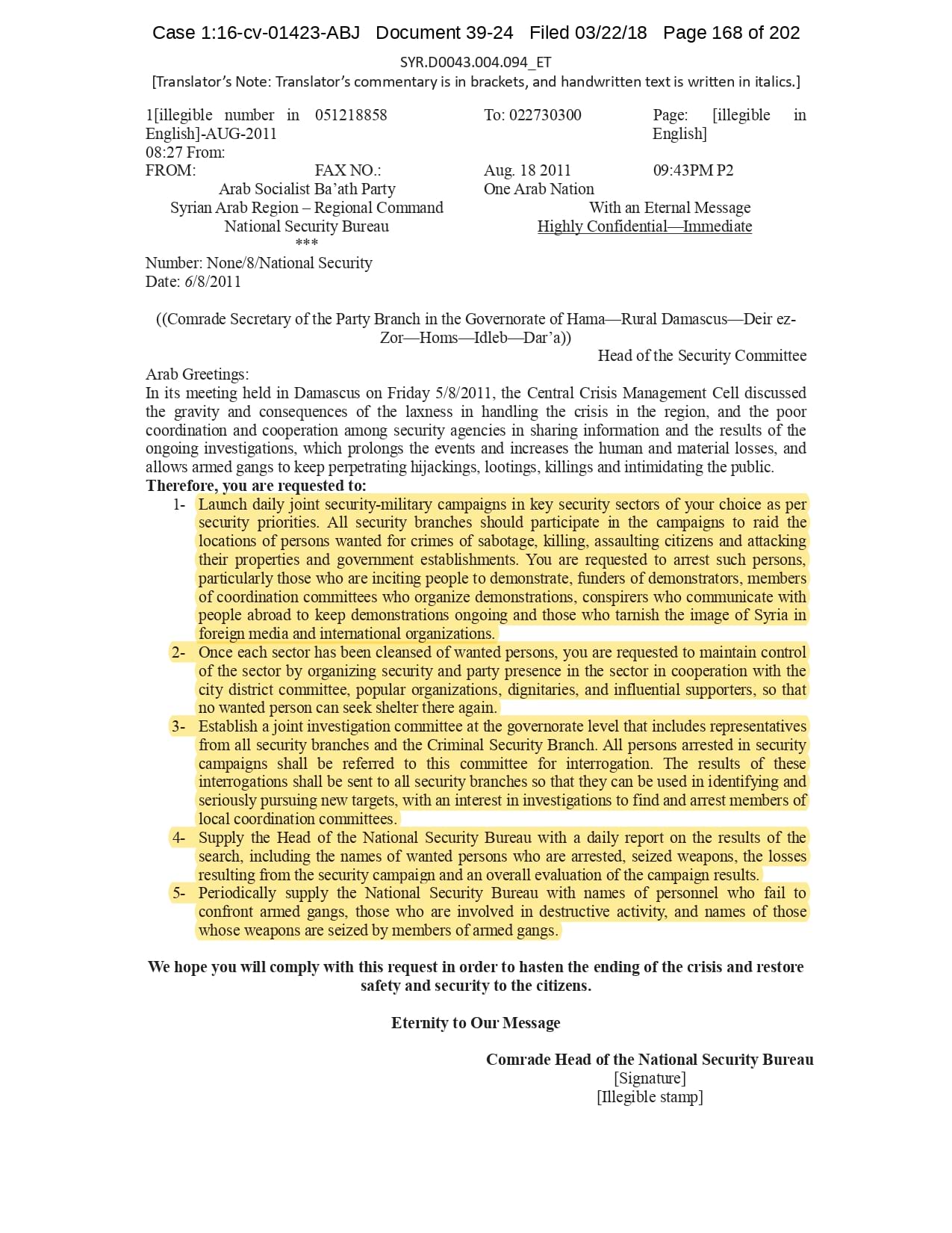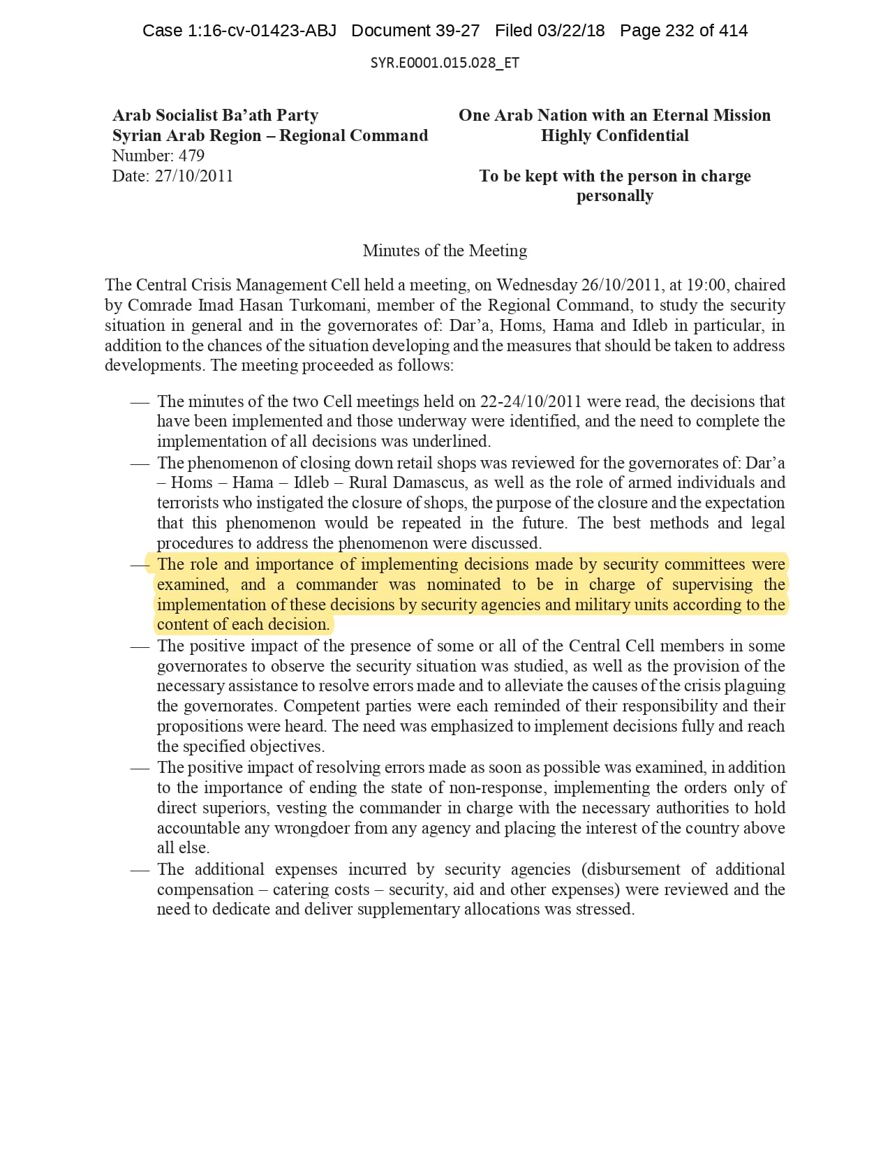 But the Regime’s own documents paint a different picture. As this report shows, the Syrian Regime knew that the demonstrators demanded freedom and democracy. Yet it formulated and then implemented policies to forcefully suppress opposition activity from early 2011. In doing so, the Regime – at its highest level - knew it was targeting civilians, many of them children, across the protesting governorates; it knew its reaction was so forceful that its own bureaucracy complained about the mounting number of dead, and did nothing to stop, prevent or punish those responsible. This report focuses on three distinct changes in the Regime’s strategy to quash the protests. In three separate Acts – played out in April, August and November 2011 – the Regime escalated its tactics to unimaginable levels, casting a dark shadow over the aspirations of the Syrians yearning for freedom.