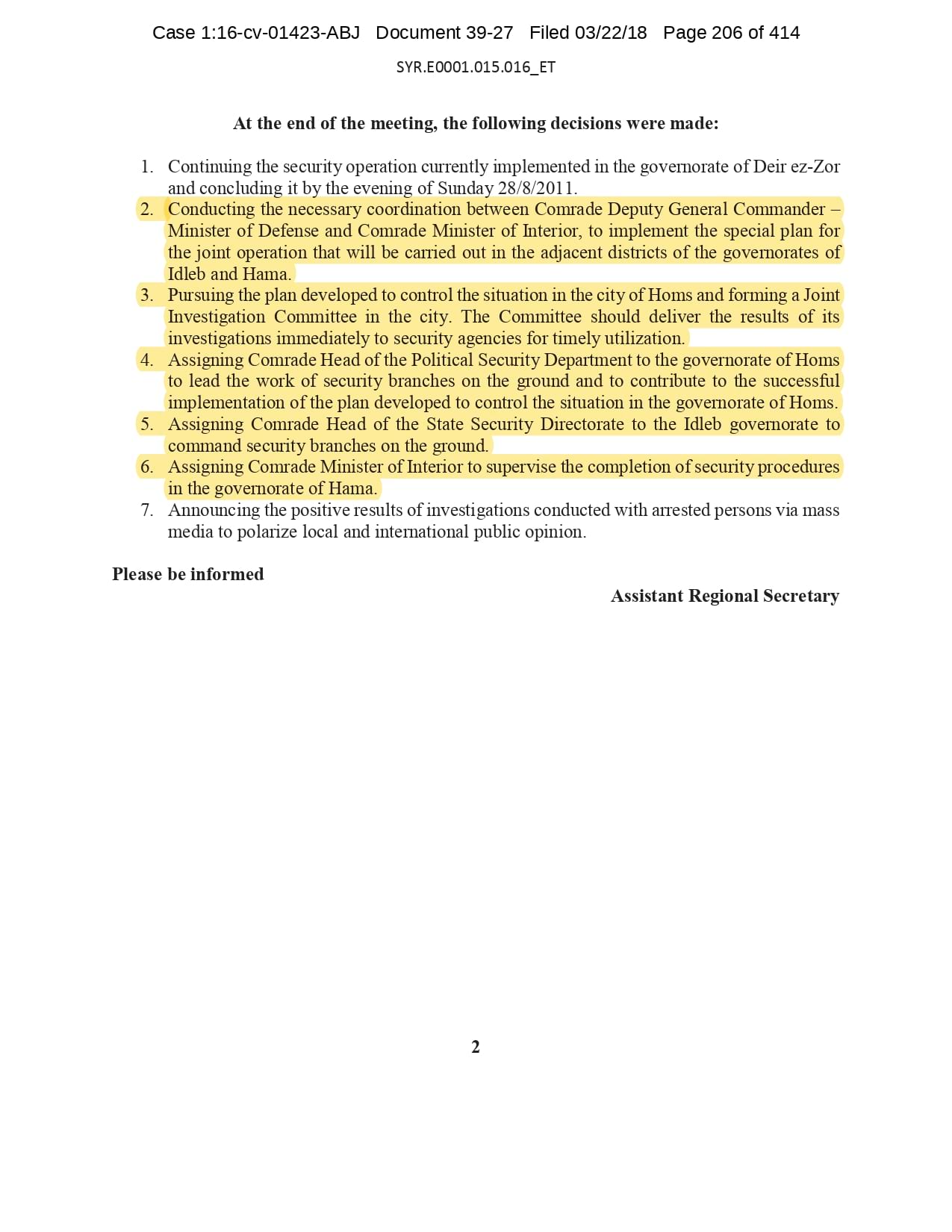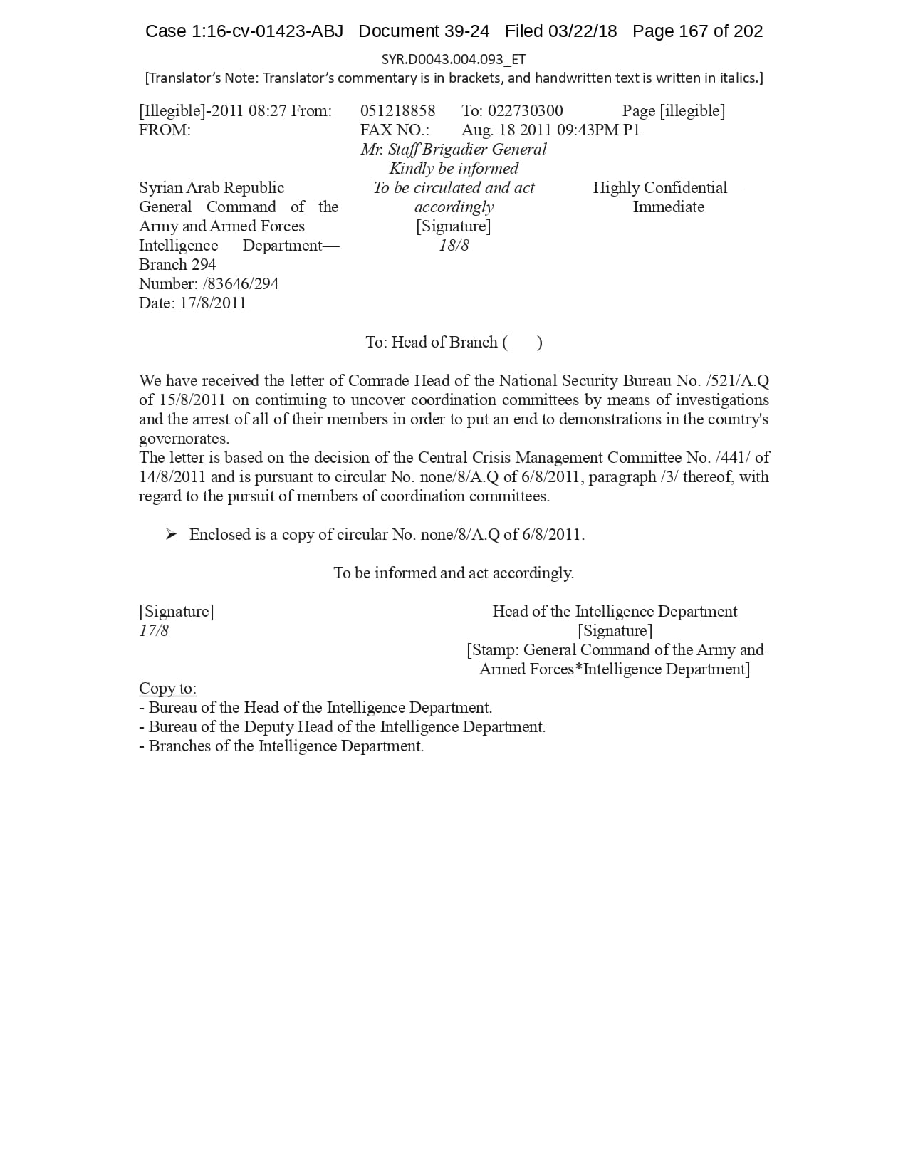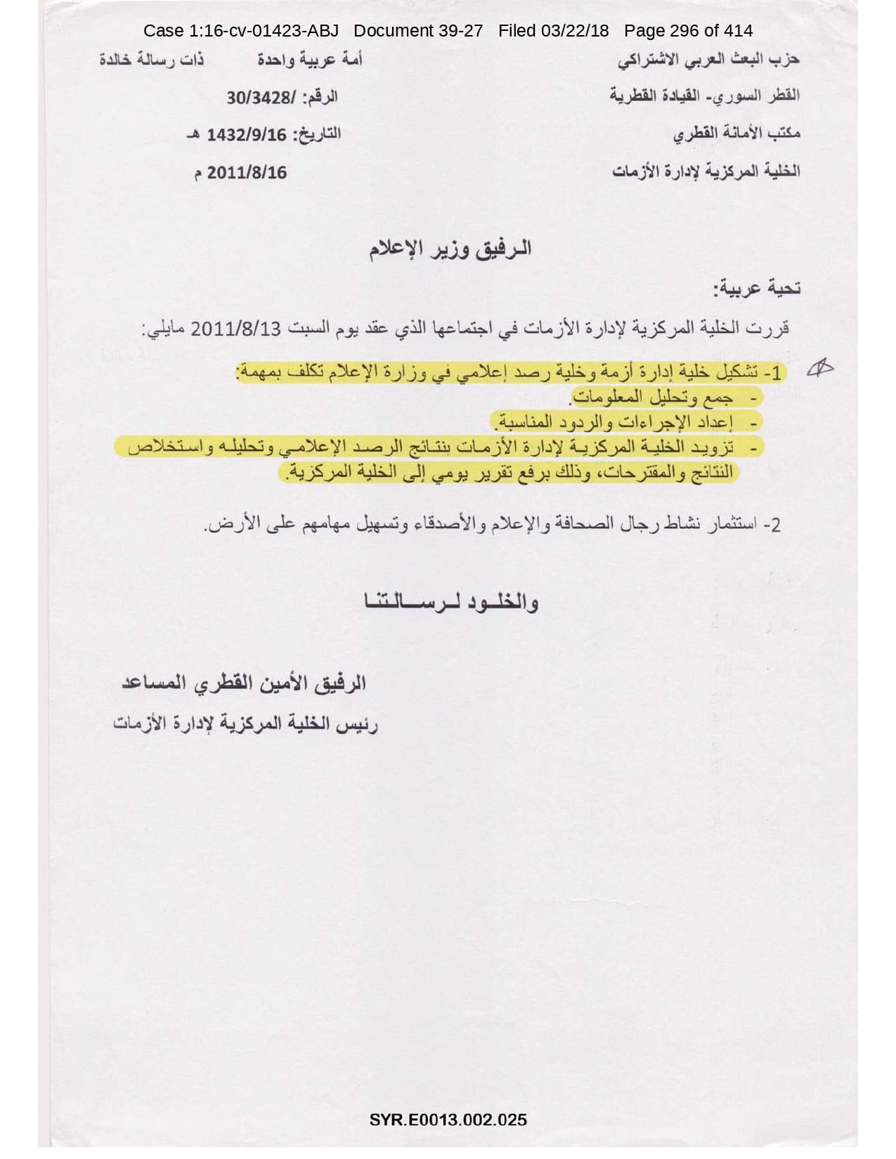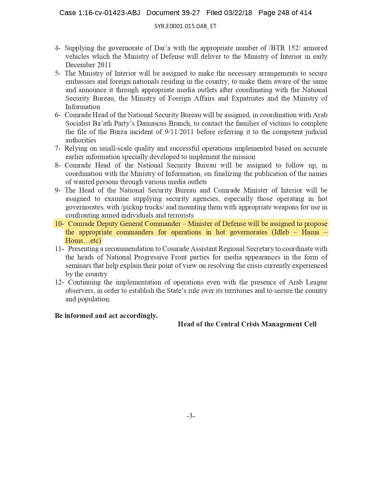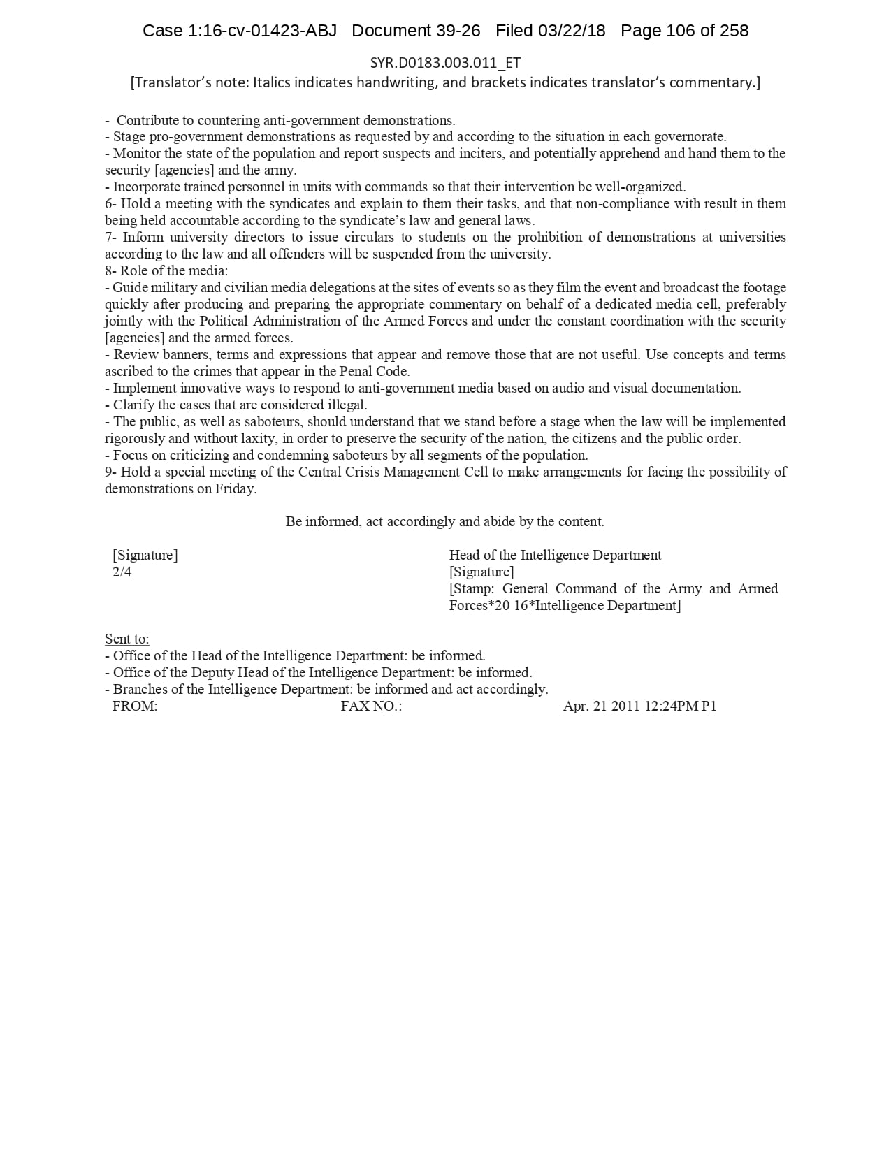 But the Regime’s own documents paint a different picture. As this report shows, the Syrian Regime knew that the demonstrators demanded freedom and democracy. Yet it formulated and then implemented policies to forcefully suppress opposition activity from early 2011. In doing so, the Regime – at its highest level - knew it was targeting civilians, many of them children, across the protesting governorates; it knew its reaction was so forceful that its own bureaucracy complained about the mounting number of dead, and did nothing to stop, prevent or punish those responsible. This report focuses on three distinct changes in the Regime’s strategy to quash the protests. In three separate Acts – played out in April, August and November 2011 – the Regime escalated its tactics to unimaginable levels, casting a dark shadow over the aspirations of the Syrians yearning for freedom.